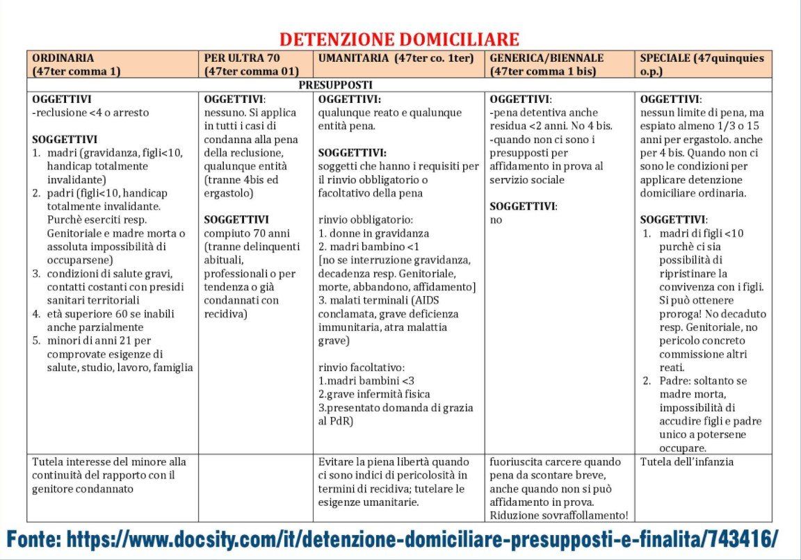 Non sempre è possibile usufruire della misura alternativa della detenzione domiciliare ma sono necessari alcuni requisiti indicati nel dettaglio in tabella. In linea generale ciò che non potrà mancare sarà un alloggio ed una persona che si farà carico delle esigenze del condannato sebbene in alcuni casi a questo può essere concesso di uscire in orario ben determinati e circostanziati per far fronte alle proprie esigenze.
