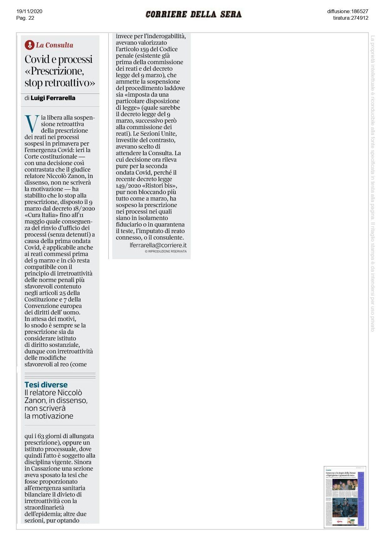 La Consulta ha pertanto dichiarato non illegittimo la sospensione del calcolo del periodo valido ai fini della prescrizione pendente durante l'emergenze Covid.